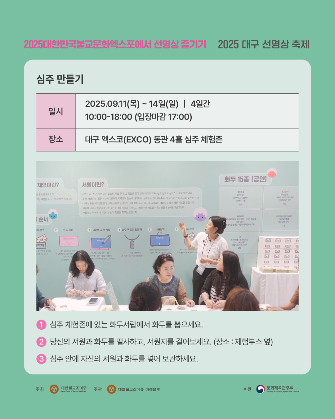 - 심주 만들기: 화두와 서원이 담긴 심주를 만들며 마음을 정돈하고, 삶의 방향을 찾아보는 특별한 시간을 만들어보세요!